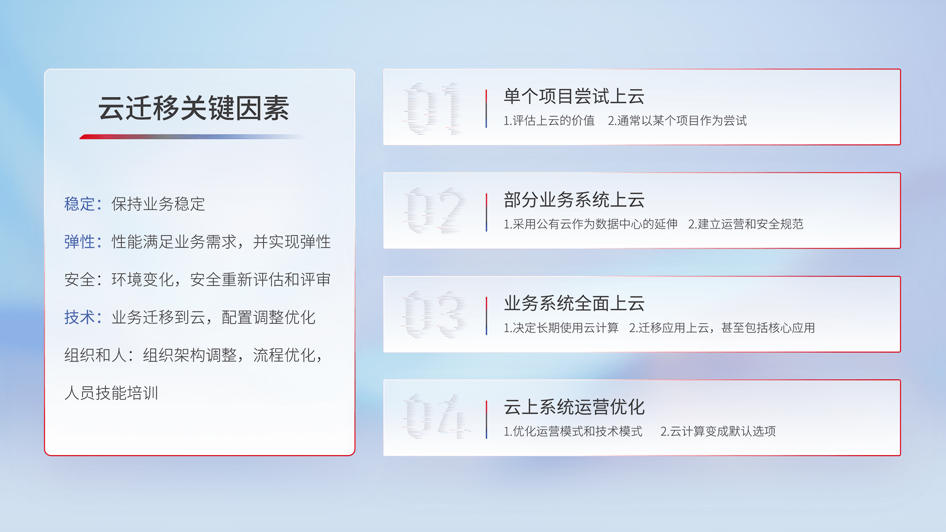 结合实际业务,,从规划设计、、、云平台选型、、、云原生改造、、、、数据迁移、、集成交付,,,,迁移全过程为客户识别最佳上云路径,,,,做好风险识别管理,,,设计网络架构、、、身份权限、、安全审计合规、、操作审计、、日志审计、、、、监控告警策略、、、多站点容灾设计等,,,对云上基础设施进行整体规划,,,提升IT治理水平,,以满足弹性、、、高可用、、、高性能的需求。。。
